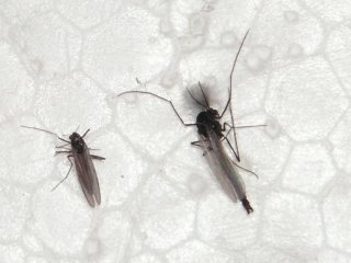 【中】ユスリカ類(左♀、右♂。路上に蚊柱がいくつも立っていました)