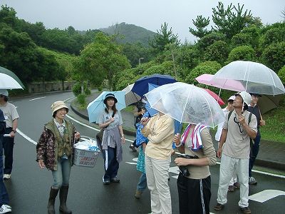【左】雨が強く降っていたので、ゴミ袋をカッパに仕立てている参加者もいました。