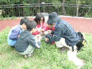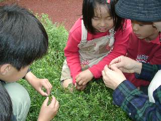 【上2枚】別の指導員は、カラスノエンドウで草笛の作り方を教えていました。さやがふくれていないので苦労していました。