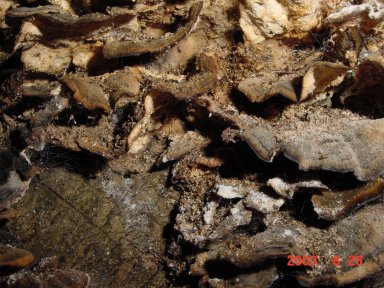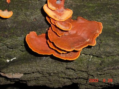 【左】朽ち木に生えたヒイロタケ これで染色もできるそうです。