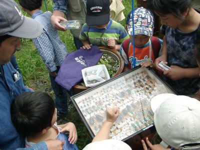 【左】講師が準備した昆虫標本。タマムシの輝きにみんな感動 【右】家族で一緒に観察