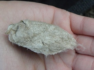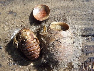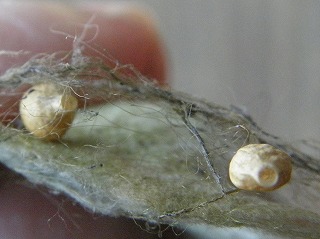 【左】イラガの繭 【中】イラガのサナギ 【右】ヤママユの繭