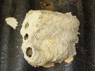 【左】アメリカジガバチ(外来)の巣 【中】ケバエの仲間? 【右】ゲジ、小さな虫を食べています