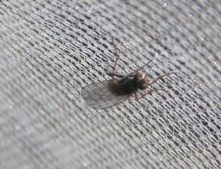 【左】オオクロバエ(冬の定番です) 【中】ハエ類(草むらの陽だまりにいました) 【右】ユスリカ類♂(トイレの壁に止まっていました)