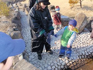 【左】始めのあいさつ。 昆虫の冬の生活を見に行きます 【右】大きな氷がとれて大喜び