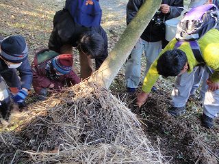 林の中では朽ち木をやさしく分解しました。コクワガタやキマワリなどの幼虫が出てくると手のひらに乗せて、「こんにちわ」とあいさつをしました。また、今回はコクワガタの成虫のオスとメスも出てきました。きょうは、おとなも子どもも[林]と[朽ち木]と[昆虫]の関係が少し理解できたかも知れません。