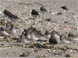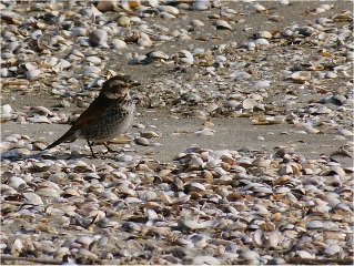 少し進むと砂浜にツグミが3羽ほど、エサを求めてちょんちょんと両足跳びで移動してはくちばしで何かを突っつく動作。すぐそばの波打ち際にはハマシギ40羽ほどが一列に並んでいて、歩いたり地をつついたり。