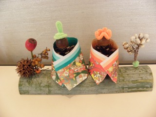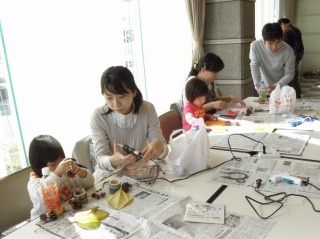 商工センターの竹を切って作っておいた輪切りの竹や節の部分を上手に使って、私たち東海市と大府市の指導員が用意したいろいろ松ぼっくり(アカマツ、クロマツ、ツガなど)やいろいろなドングリや木の実を、千代紙、色紙、木切れなどを使ってかわいく飾って、みなさんとても立派な作品をつくることができました。(記・吉川洋)