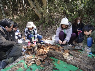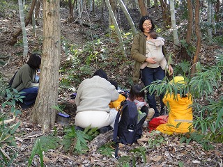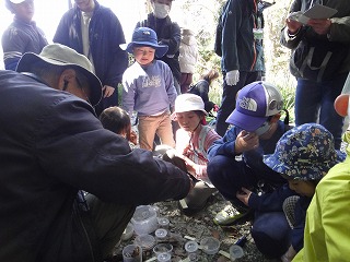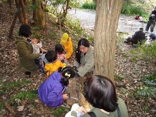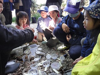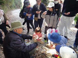 【左】朽ち木解体、観察広場 【右】「語り部」と子どもたち