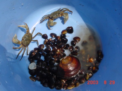 【右】がんばって採ったものです。入っているのはアイハラガニ、ヤマトシジミ、イソシジミです。