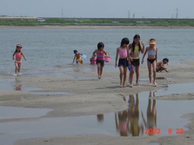 ちょうど12時ころ矢作川河口の矢作川大橋を渡りながら河口を眺めました。大きな干潟が現れ、そこでたくさんの人が何かをしているみたいです。早速、近づいてみたところ、皆さんシジミを採っていました。シジミは汽水域に生息するヤマトシジミでした。ここにいたのは地元の年配の人がほとんどでした。中に若い4家族が楽しくシジミを採ったり、子ども達と水遊びをしたりしていました。何処からきたか聞いた所、刈谷市からでした。夏休みが終わるので子どもが通園している幼稚園の仲間と来たとのことでした。どうしてここを知っているか聞いた所、中の1人が地元出身とのことでした。子どものころ家族でここにシジミ採りにきて楽しかったので子どもにも体験させたくて幼稚園の友達を誘ったとの事でした。