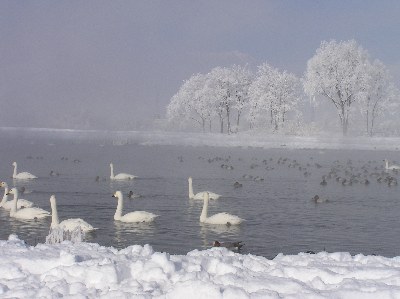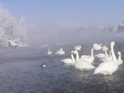 【右】白鳥は犀川ダム湖の上流400メートルに休んでいました。