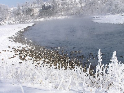 【右】南安曇郡豊科町の犀川ダム湖です。台風でダムが決壊し、カモばかりでした。