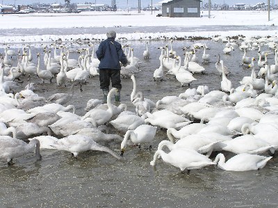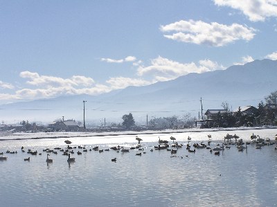 【左】南安曇郡穂高町狐島の水田に水を張り、白鳥に餌を与えています。