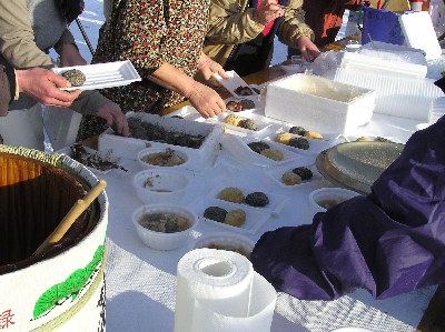 【左】搗き立ての餅はアンコロ、キナコ、ゴマ和えにしていただき、いずれもおいしかったです。