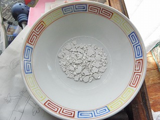 【左】底に溜まったデンプンの部分を器に移す 【中】上澄みの透明部分の水を流し、乾燥させる 【右】ワラビのデンプン50gに水200CC加える