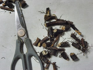 借地で野菜を栽培している畑で二年ほど畑を耕さず簡単な除草だけをしていたらワラビが侵入してきました。ワラビを絶やすためにスコップでワラビの根を掘ったところ黒く太い根が出てきました。根の断面を見たところ白い部分があり、いかにもたくさんでんぷんを含んでいるように見えました。早速の思いつきでのでワラビのでんぷんを採集しワラビ餅を作ってみることにしました。(記・降幡)