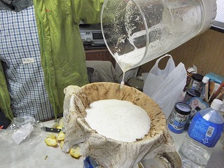 【左】水を入れて、ミキサーで砕く 【中】砕いたもの 【右】晒しで絞る