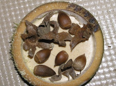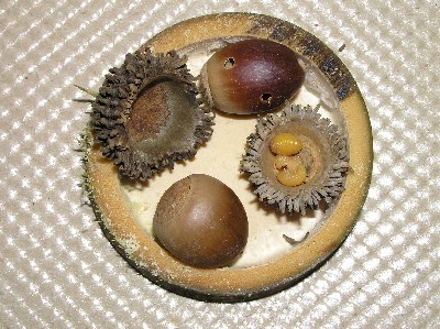【左】アベマキです。殻斗(かくと)に入っているのはクリシギゾウムシで炒って食べるとおいしいです。