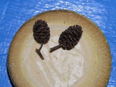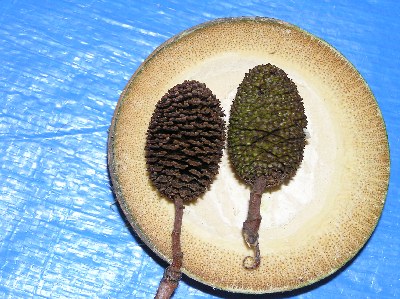 【左】ハンノキの実です。水気が好きです。新潟県では稲掛けのハゼにする木に利用しています。