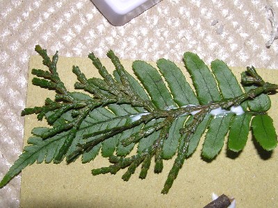 【右】ヒノキの葉とベニシダの葉。