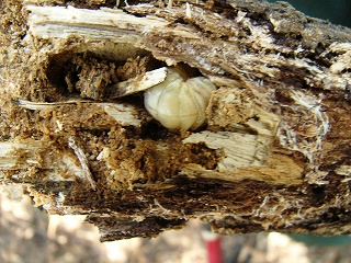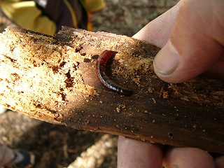 初め、巨大なシイの木の生えているところで朽木を調べてみましたが、ワラジムシ、シロアリ、小さな土壌生物程度しか発見できませんでした。浅井氏が森の南斜面でコクワガタの幼虫を発見したのでみんなで場所を移動し、コナラやアベマキの朽木を中心に昆虫を探したところ、次から次へとコクワガタの幼虫が発見でき、成虫も2匹見つけることができました。