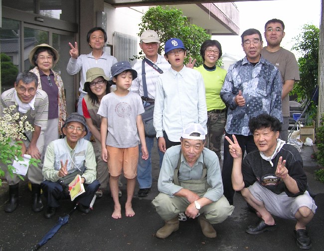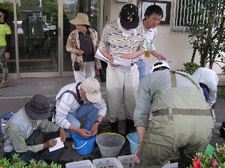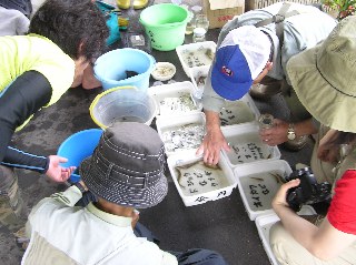 【左】阿久比板山公民館の玄関を借りて採集した生き物の分かち合いです。