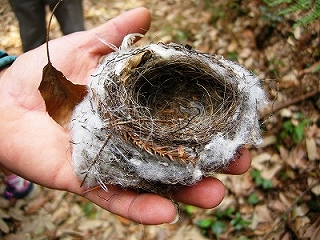 【右】メジロと思われる巣。化繊の綿やビニール紐も使われている
