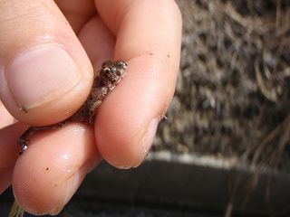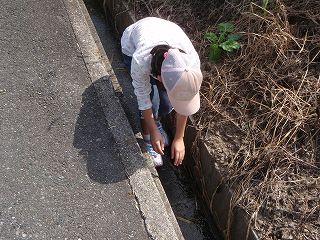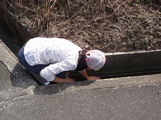 側溝の底は湿っていて、小さなヌマガエルがたくさんいました。捕まえようとするとぴょんぴょん跳んで逃げます