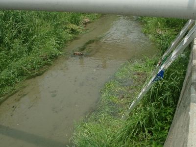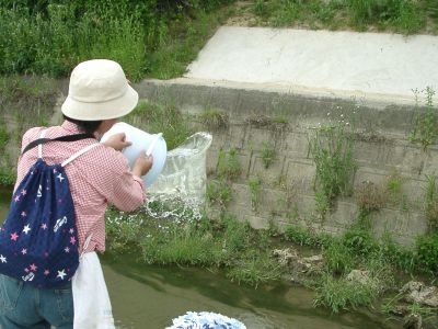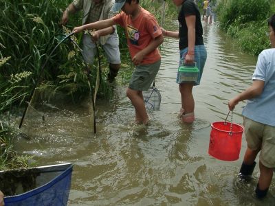2003.5.24 知多市信濃川にて川の生きもの自然観察会を実施しました(知多市『梅の館』と共催)。浅くて安全で、しかも、色々な種類の生きものが捕まえられると期待できるポイントです。でも、川へ下りる階段が近くにありませんので、脚立等の準備が必要です。また、付近にトイレはありませんでした。