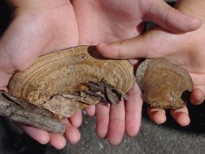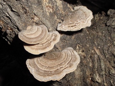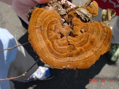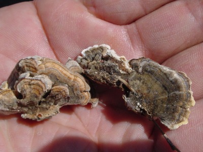 【左】瓦状に重なって発生するカワラタケです。ガンの増殖を押さえることが出来るということで薬用にされています。
