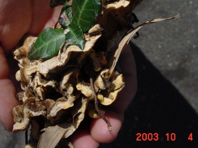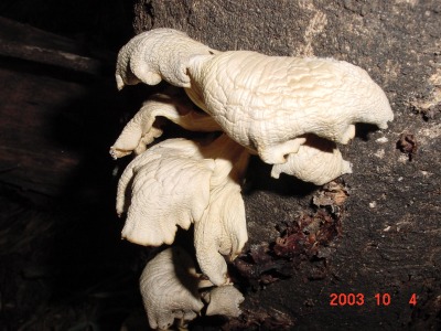 【右】カクレミノの枯れ木に生えていたウスヒラタケ(食)です。