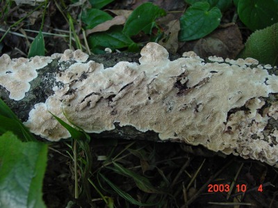 【右】広葉樹の枯れ木によく生えているホウロクタケです。