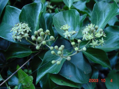 【右】フユヅタの花です。秋から晩秋に花を咲かせ、受粉してくれる虫さんを待ちます。越冬昆虫の食料の提供で関係しています。