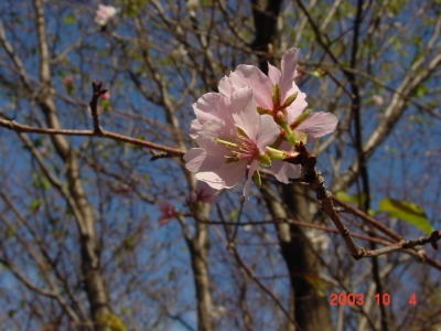 【右】サクラの花です。今年は夏にアメリカシロヒトリが大量発生し、サクラの葉を丸坊主にしてしまいました。こんな時によく秋に花が咲きます。