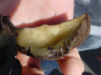 【右】オオゴムタケを真ん中から切ったものです。ゼラチンみたいで生食できます。