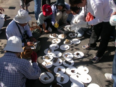 【左】最後に採集したキノコを種類別に紙皿に乗せて名前を付けてからまとめを行ないました。