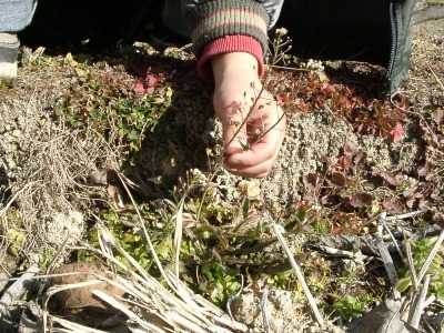 最近、七草の全部が採集できるところが少なくなっています。一番手に入らないのはホトケノザ(コオニタビラコ)でしょう。七草のころ八百屋さんでパック入りの七草が販売されています。水田にいくらでもあったホトケノザが最近無いため栽培して七草用に販売しているそうです。ちなみに、「梅の館」近くの水田にたくさん生えています。ここの水田は圃場整備されていなく、形や大きさが不揃いです。(水田に入る時は持ち主の了解を取ってください)ホトケノザは種子に冠毛(かんもう)が付いていないので種を飛ばすことができません。水田を圃場整備するとホトケノザは移動できないので再び生えるのに長い年月が必要なのです。