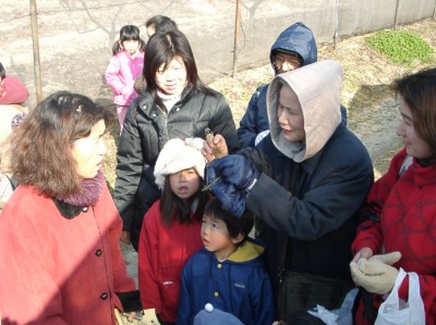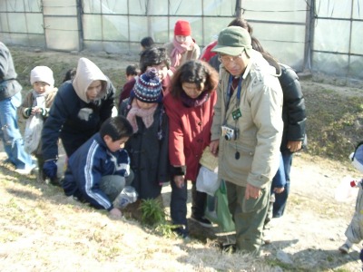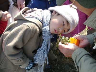 【左】先輩がナズナでの遊び方を披露しています。ナズナは利尿、解熱に効果があるといわれています。