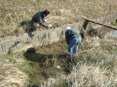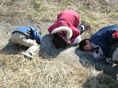 【左】子供たちが側講の穴を使い、側溝通信をしています。子供はいろいろな遊びを考えます。