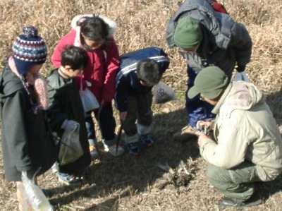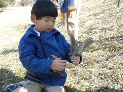 【左】真っ先にキジの死体に、子供たちが集まりました。死体を見ることも自然を理解する上で大切なことです。