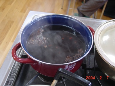 【右】既に調理が始められていました。これはタンポポの根を黒くなるまでフライパンで炒って、煮出しています。(タンポポコーヒー)