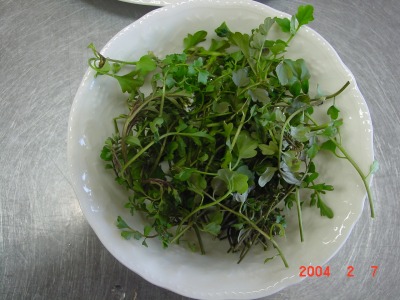 【左】タネツケバナの生です。刺身のツマによく合います。少しワサビ見たいにピリイとします。