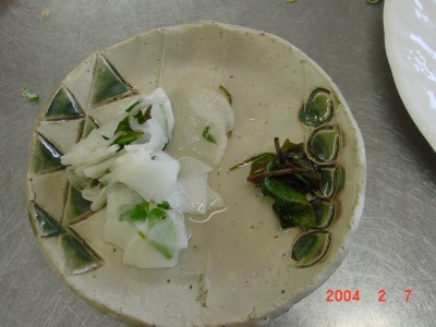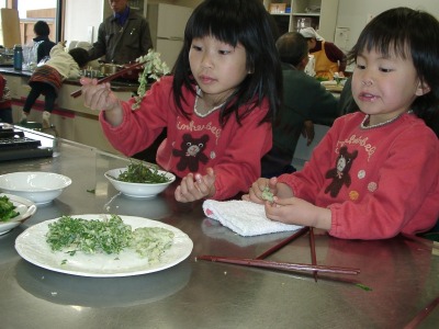 試食にした野草は近くで採集した物を使いました。調理は「梅の館」で調理を担当している講師の方に協力していただきました。よって出来上がりは、料理屋さんで作ったようなものができました。参加された方は美味しい美味しいの連発でした。