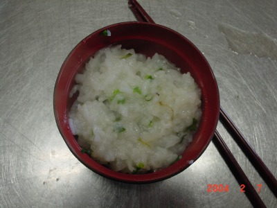 【左】七草入りのお粥です。スズナ、スズシロは人工物で、その他の5種類が揃うところは最近少なくなっています。