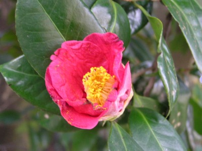 【左】サザンカです。メジロがよく蜜を吸いに来ます。