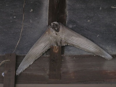 【右】スズメが電線に止って、私たちを見下ろしていました。