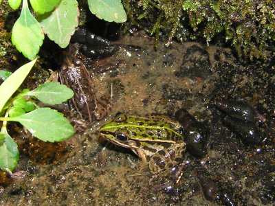 【左】スジブトハシリグモのお母さんでしょうか。サカマキガイとカワニナも写っています。