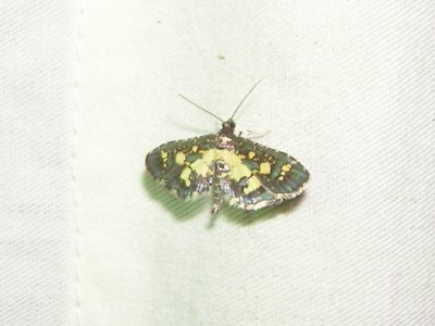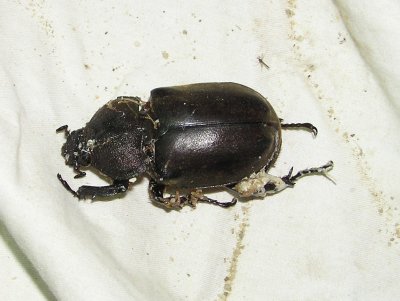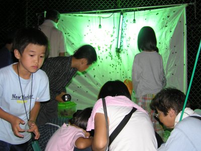 北側からグランドの森を回り、灯火採集している場所に戻ったところ驚く無かれ、写真のごとくカナブンが集団でやって来てました。先月18日の灯火採集の時にカナブンが1,2頭だったのに一月の間にこんなに変化がありました。