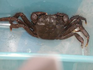 【左】スクミリンゴガイ(ジャンボタニシ)です。今まで見られませんでした。南米原産の外来生物でイネに被害を出しているそうです。食用に出来ますので試食しますか。 【右】毎年たくさんのモクズガニが取れます。